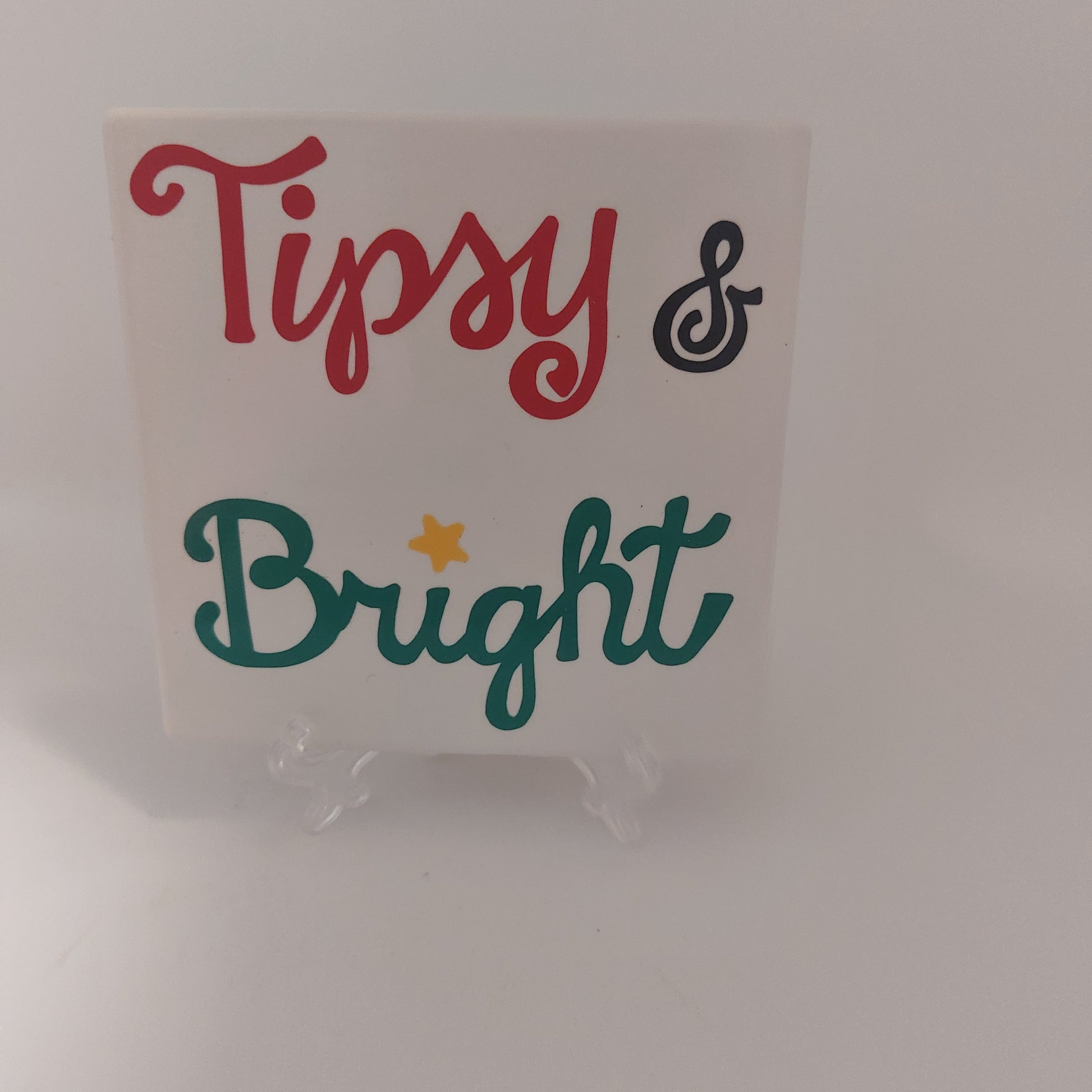 Add a splash of cheer to your holiday sipping with this 4-inch white ceramic coaster featuring the playful phrase "Tipsy and Bright." Perfect for wine nights, holiday parties, or gifting to your favorite festive friend. Sleek, glossy, and ready to catch every merry drop—because the only thing spilling this season should be laughter and a little eggnog!